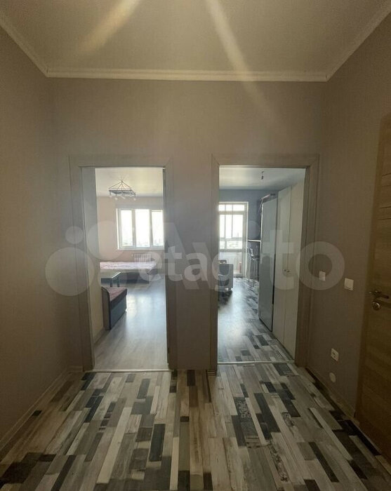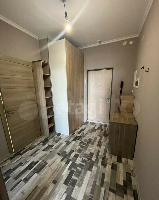 - В просторной прихожей находится функциональный шкаф купе с зеркалом в пол и пристенной тумбой.
