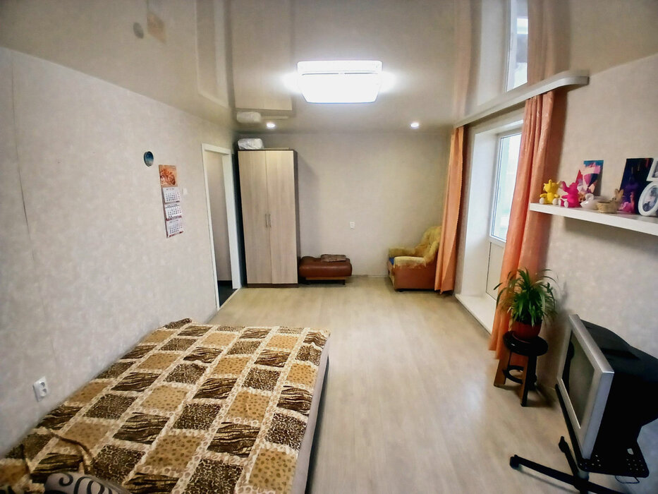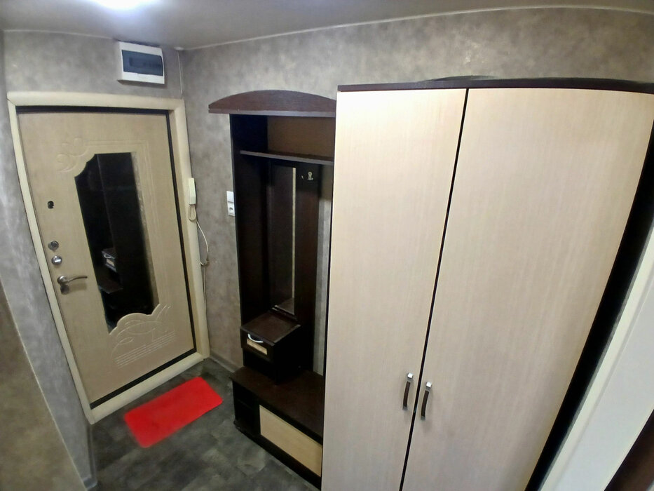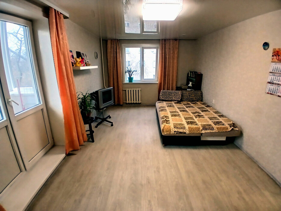 Состояние обычное, но заехать и жить можно, пластиковые окна, счетчики на воду и эл., сейф-дверь. Комната правильной квадратной формы, с нишей под шкаф-купе. Балкон остеклен, на полу плитка. Кухня 9 кв.м. Санузел совмещенный, в кафеле. Достаточно вместительный коридор, также имеется полезная кладовая.