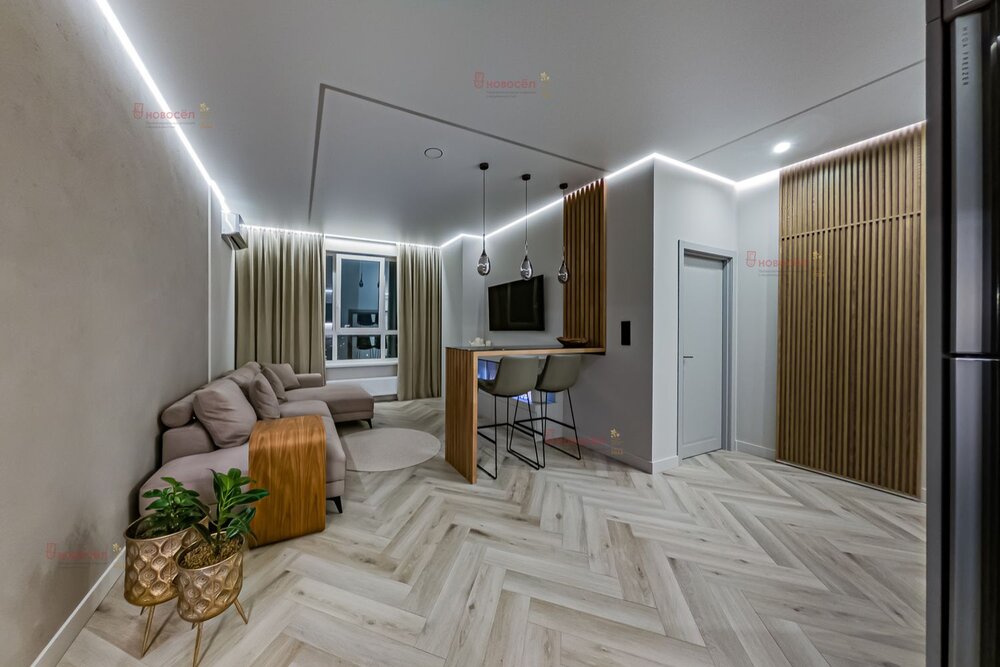 В квартире сделан качественный ремонт: тёплый пол во всех комнатах, обои под покраску (можете выбрать финальный цвет), межкомнатные двери фирмы с фурнитурой. На полу кварцвинил Moduleo Next. Ванная под ключ: стены в кафеле, инсталляция, проточный водонагреватель. Всё новое, на гарантии.