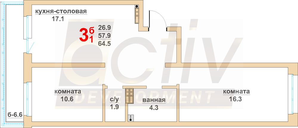 Общая площадь:57 м2