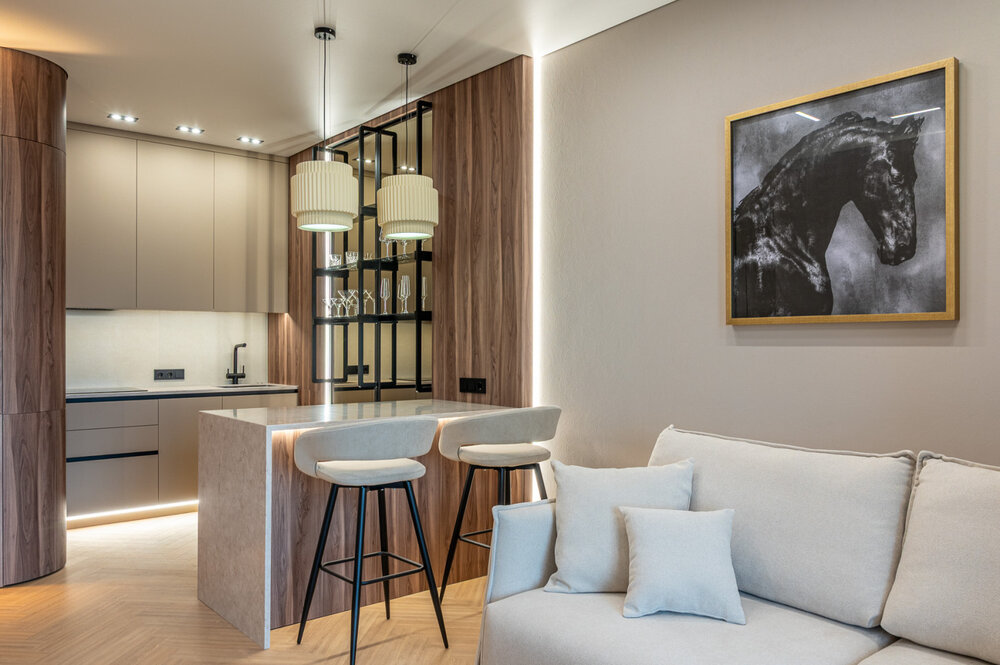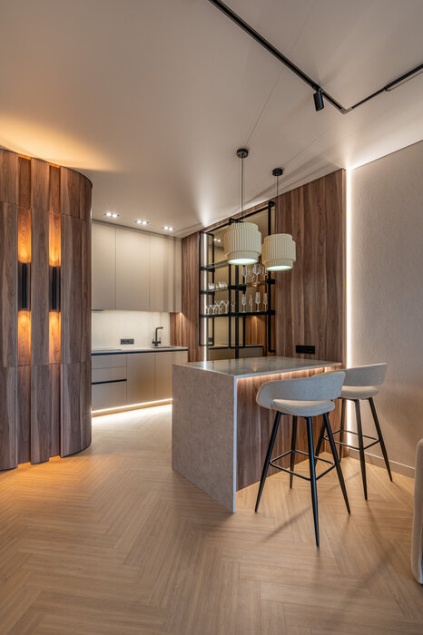 Во всей квартире продуманы различные сценарии освещения - от большого света до мелких подсветок - бра, подстветки цоколя или острова, создавая тот уют который нужен именно вам.