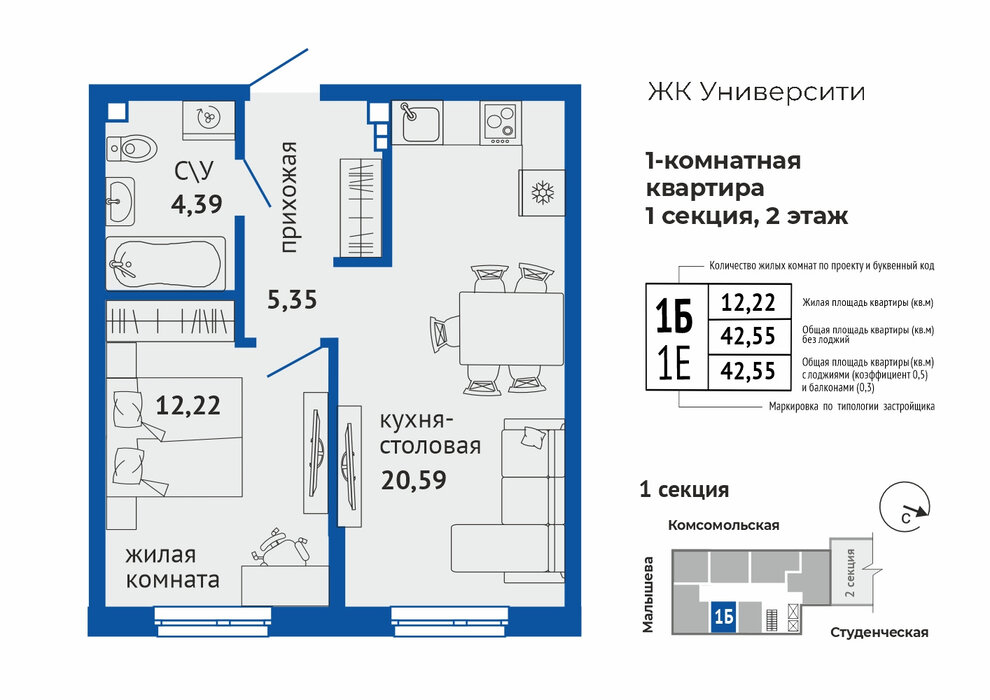 • 1-к квартира, улица Блюхера, 38, ЖК "Теплые кварталы" — 1 кв. 2026 г.