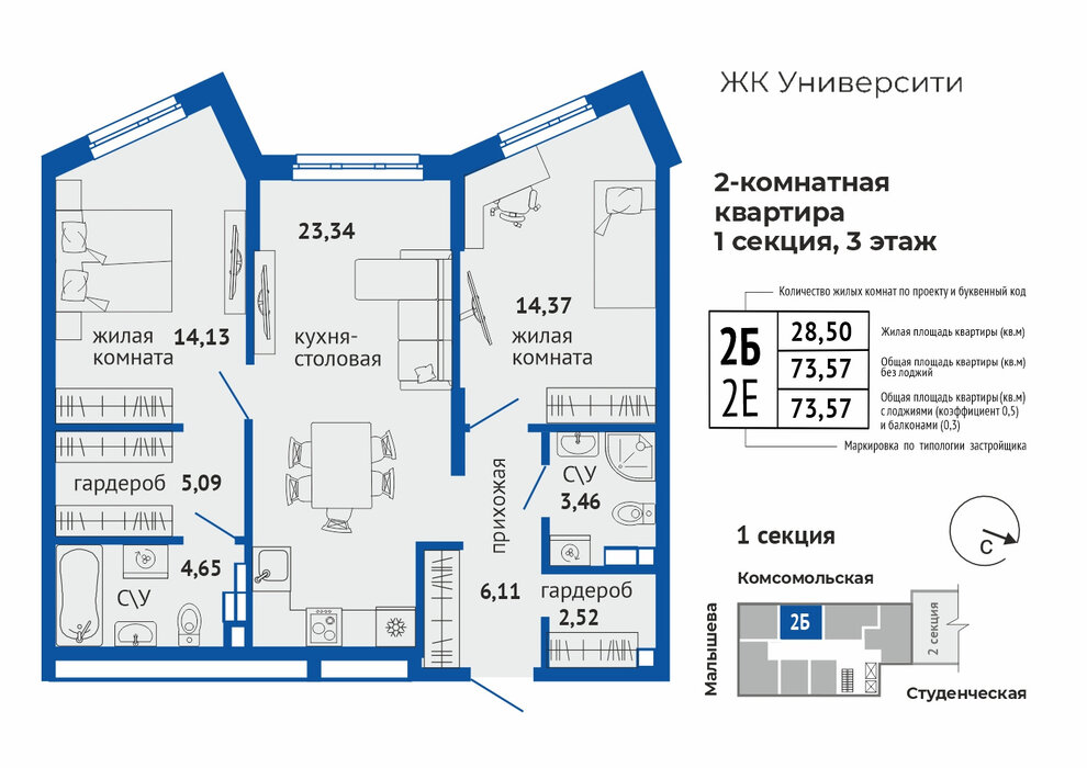 Общая площадь:73.57 м2