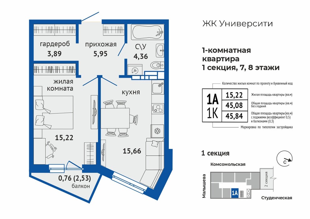 1-к квартира, Блюхера, 26 — 4 кв. 2025 г.