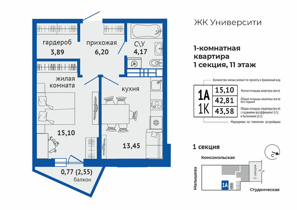Общая площадь:43.58 м2