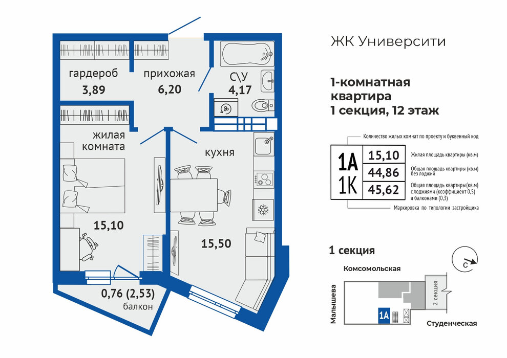 1-к квартира, Блюхера, 26 — 4 кв. 2025 г.