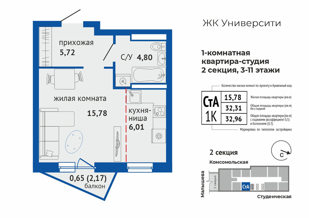 Общая площадь:32.96 м2