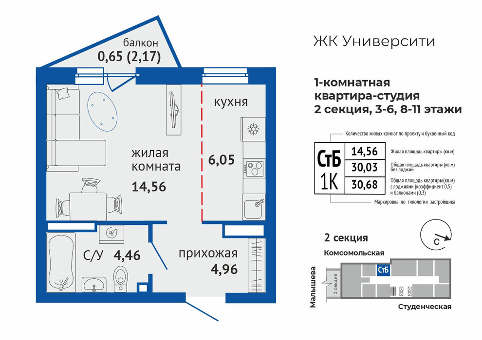1-к квартира, Блюхера, 26 — 4 кв. 2025 г.