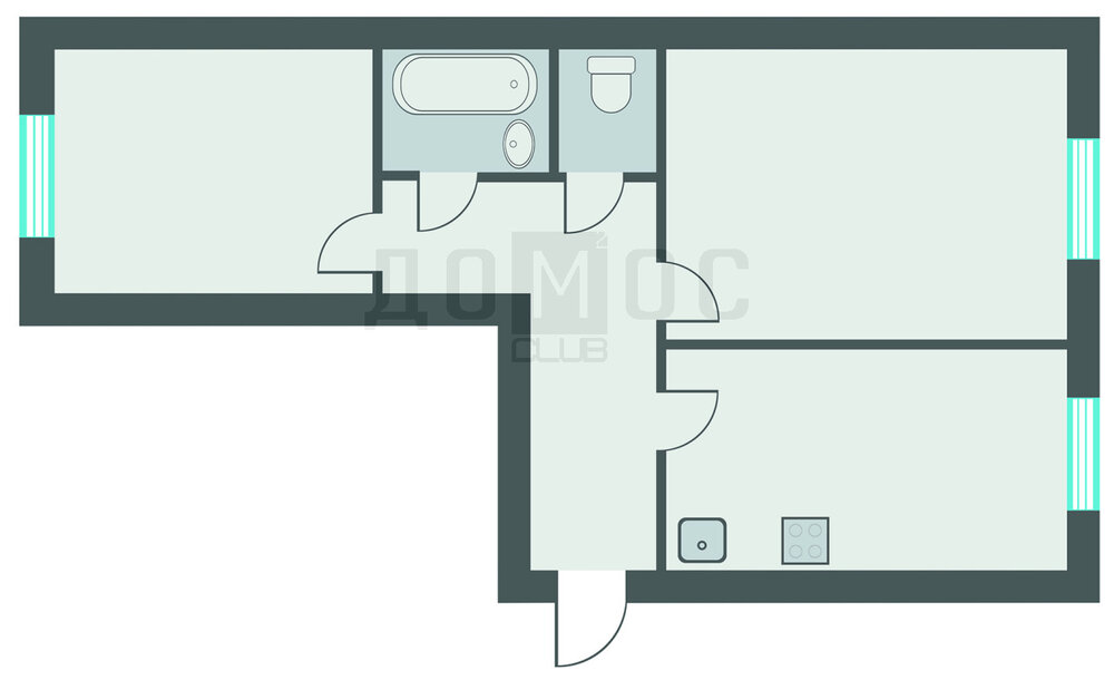 Очень удачная планировка: комнаты изолированные (выходят на разные стороны, обе просторные и правильной формы); раздельный сан. узел; кухня прямоугольная, но вместительная.