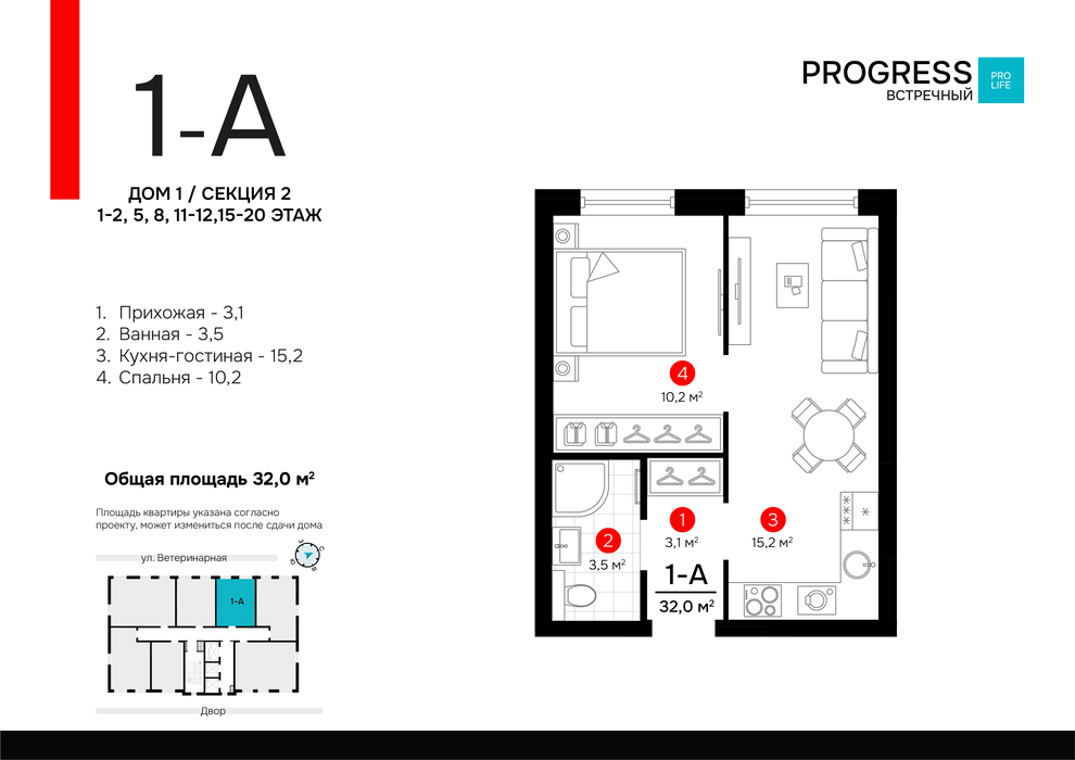• 1-к квартира, Ветеринарная, 16, ЖК “PROGRESS Встречный” — 4 кв. 2026 г.