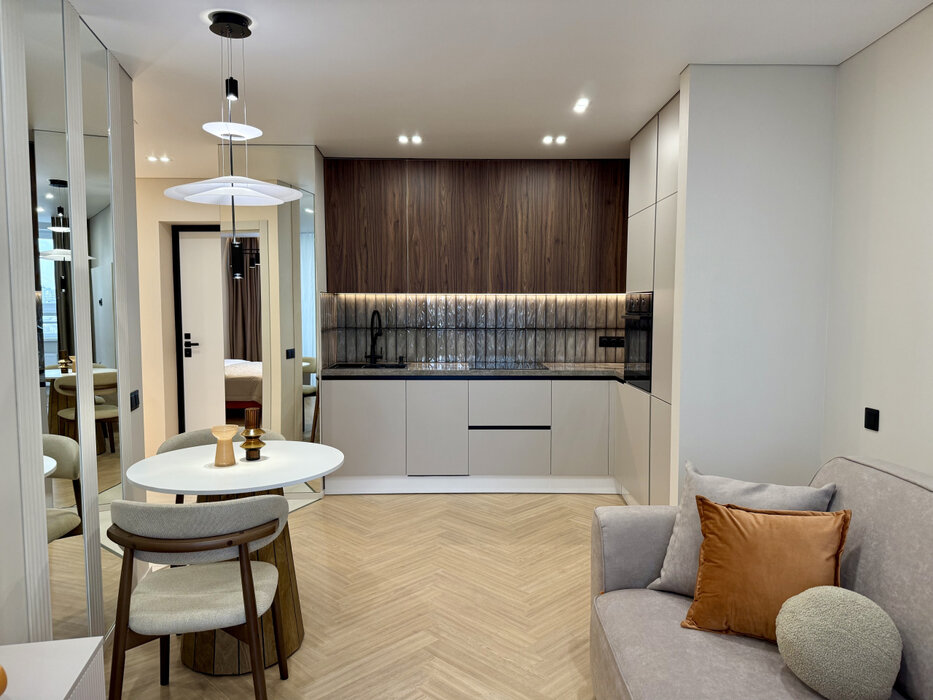 Жилая площадь составляет комфортные 24 квадратных метра, а кухня занимает 9.6 квадратных метров, предоставляя достаточно места для приготовления и приема пищи. Квартира после качественного евроремонта, что позволит новым владельцам сразу же заселиться без дополнительных вложений и ремонтных работ. Санузел совмещённый, выполнен в стильном современном дизайне. Окна квартиры выходят на улицу, обеспечивая достаточное количество естественного света в течение дня.