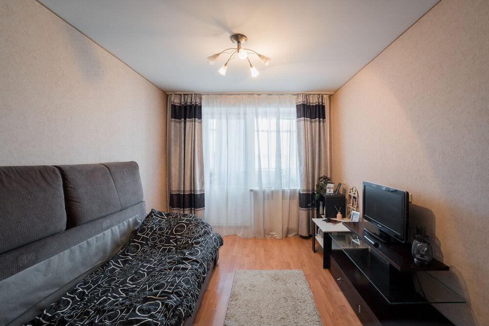 Функциональная планировка: кухня-гостиная, комната, просторный сан.узел. Счетчики ХВС и ГВС, двухтарифный электросчетчик, теплосчетчик.