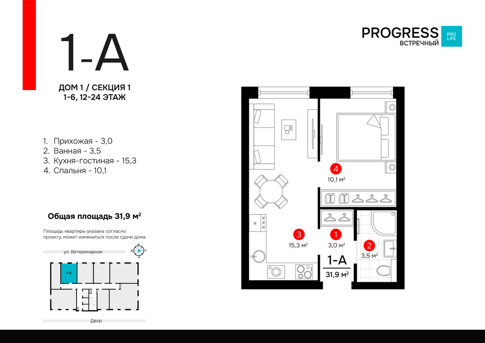 • 1-к квартира, Ветеринарная, 16, ЖК “PROGRESS Встречный” — 4 кв. 2026 г.