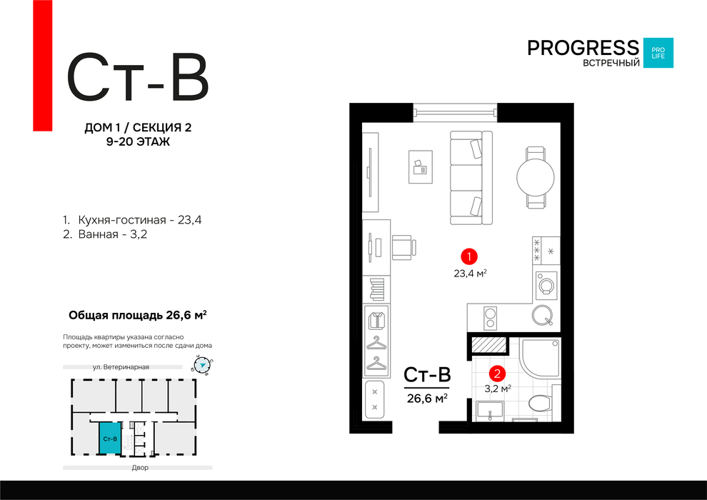 • 1-к квартира, Ветеринарная, 16, ЖК “PROGRESS Встречный” — 4 кв. 2026 г.