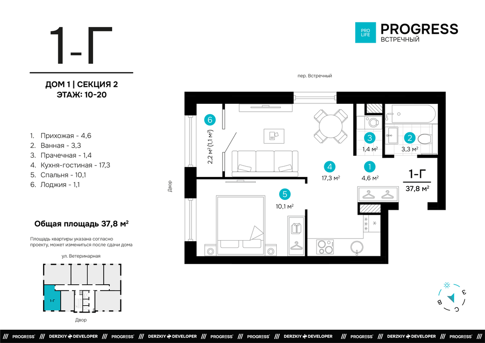 Екатеринбург, ул. Ветеринарная, 16, ЖК “PROGRESS Встречный” (Дом 1) (Юго-Западный) - фото квартиры 21 января 2026 90 дн. 1 33 13/25 5 490 000