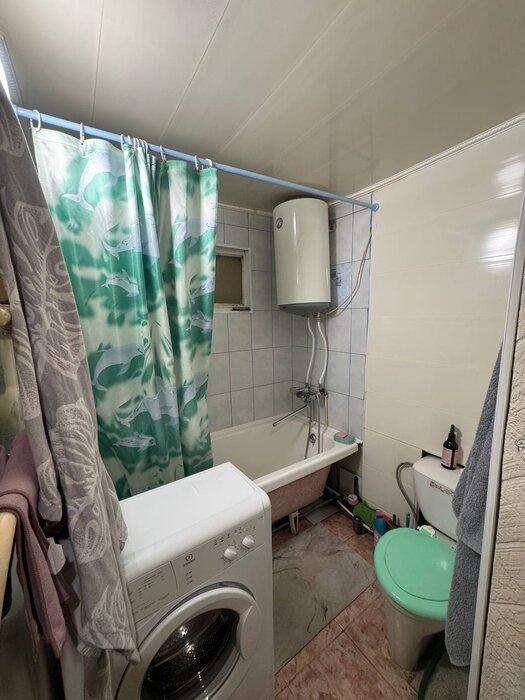 Большой 5 м2 совмещенный санузел в итальянской кафельной плитке. Есть место для стиральной машинки. Установлены душевая кабина, электрический водонагреватель, счетчики холодной и горячей воды.