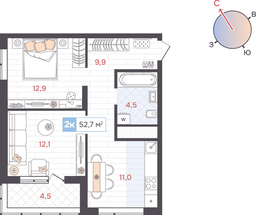Общая площадь:52.7 м2