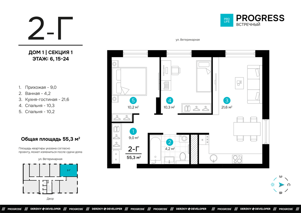 Екатеринбург, ул. Ветеринарная, 16, ЖК “PROGRESS Встречный” (Дом 1) (Юго-Западный) - фото квартиры 21 января 2026 90 дн. 1 33 13/25 5 490 000