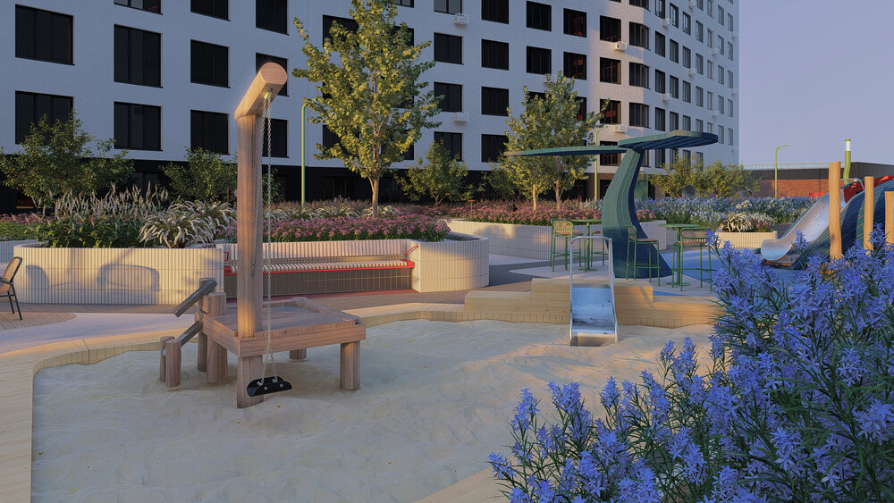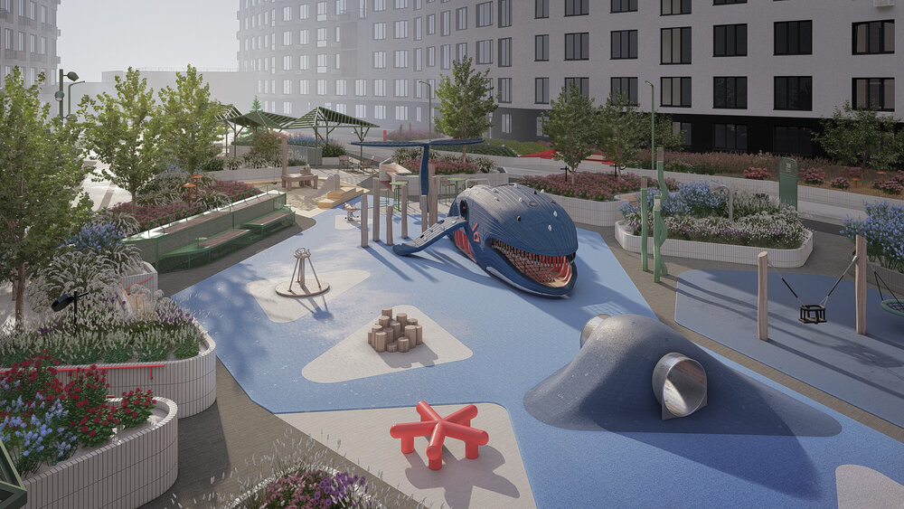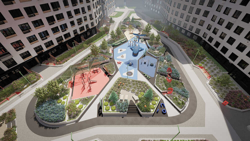 двор-парком с продуманным ландшафтным дизайном и различными зонами отдыха и активного времяпрепровождения.