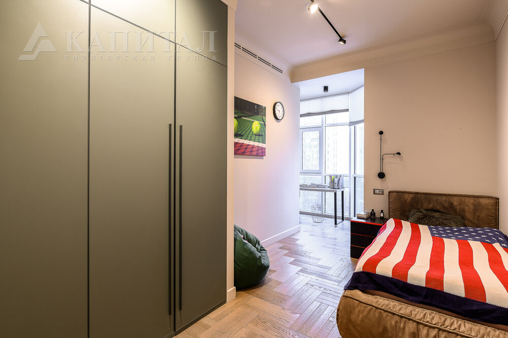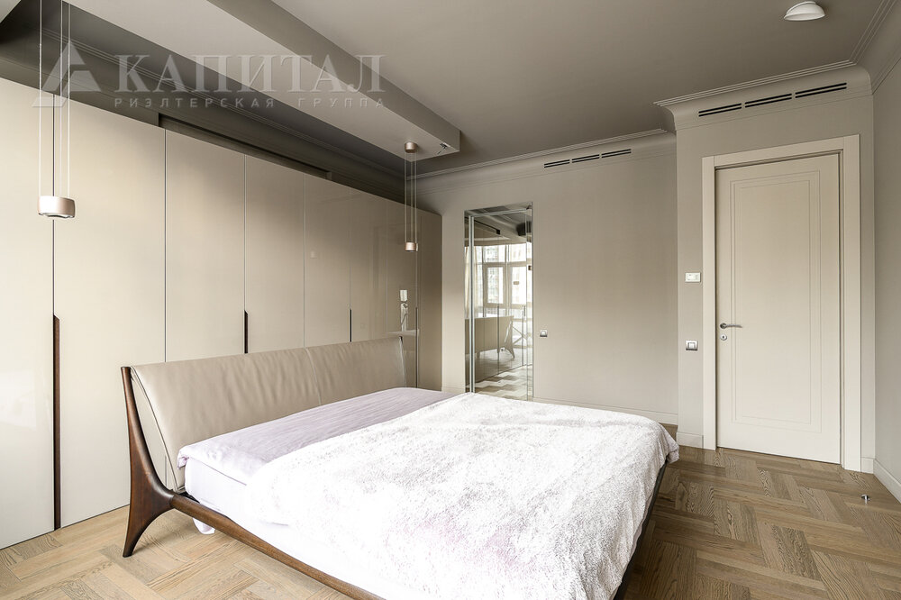 Пространство квартиры выстроено безупречно: просторная кухня-гостиная площадью 56 м², три изолированные спальни (от 14 до 30 м²), несколько санузлов, холл, гардеробная зона и лоджия. Особый шарм придает одна из спален с панорамным остеклением.