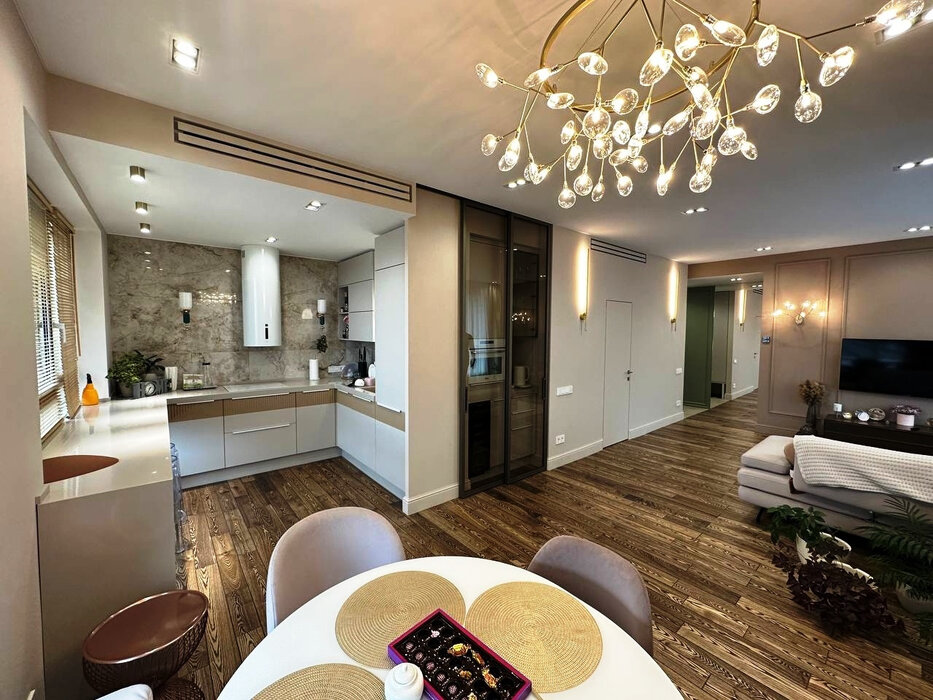 Объект № 187152. Клубный дом «Ленина 8» – это дом премиум-класса в самом центре города. Сервис 5* отеля, консьерж-администратор, роскошное лобби, безопасность и комфорт. Двухуровневый двор с эксклюзивным ландшафтным озеленением, плейхабами и релакс-зонами. Продается видовая 2- комнатная квартира в клубном доме с прекрасной планировкой: кухня-гостиная + две изолированные комнаты + две гардеробные + гостевой санузел + ванная комната + лоджия. Дизайнерский ремонт. На входе предусмотрена оборудованная гардеробная (гардеробная система Titan-GS) для сезонной одежды и обуви. Рядом расположен гостевой санузел, прачечная (стиральная и сушильная машины Bosch). Следом, по коридору, еще одна оборудованная гардеробная. Далее расположены кухня-гостиная, ванная комната и две спальные комнаты, в одной из которых расположена лоджия. При ремонте были использованы самые качественные материалы отделки, премиальные бренды: по всем стенам квартиры и потолку сделана звуко-теплоизоляция, благодаря чему счета за отопление минимальные. Отделка стен декоративным покрытием с эффектом шелка. Межкомнатные двери из массива дерева, итальянская фурнитура MORELLI с магнитными замками. Электрика SCHNEIDER ELECTRIC с мастер-выключателем для всей квартиры, датчиками автоматического включения в санузлах и гардеробной, теплыми полами в ванной комнате и на кухне. Выполнена разводка светильников, люстр. Коллекционная кафельная плитка и керамогранит на полу DUAL GRES (Испания). Паркетная доска KAHRS (Швеция) класса «А» из натурального дуба возраста не менее 150 лет, укладка «английская ёлочка». Встроенная кухня премиального бренда VIRS (фурнитура BLUM), встроенная кухонная техника BOSCH (Германия) белого цвета (микроволновая печь, духовой шкаф, варочная электропанель, посудомоечная машина), 2 встроенных холодильника WEISSGAUFF (FULL NO FROST) и ELECTROLUX, вытяжка ELICA (Польша), керамическая кухонная мойка OMOIKIRI (Япония), кухонный смеситель KAISER (Германия) c встроенным краном для фильтрованной питьевой воды, трехступенчатая система очистки питьевой воды, измельчитель пищевых отходов BORT (Германия), бесшовная цельная кухонная каменная столешница с кухонным фартуком LG HAUSYS, 4 вида освещения на кухне. Отделка окон по всему периметру из искусственного камня. Теневой натяжной потолок с подсветкой по всей квартире. Климатическая система TION в каждой комнате (поступление отфильтрованного воздуха и, при необходимости зимой, подогретого до 25 градусов тепла воздуха в трех режимах. Предусмотрено дистанционное управление с мобильного телефона). Сплит-система кондиционирования BALLU. Смесители, душевая система HANSGROHE (Германия), унитазы DURAVIT (Германия) с инсталляцией GROHE (Германия), стеклянная душевая перегородка и каменный душевой поддон, мебель в ванных комнатах из массива бука со стразами SWAROVSKI. Локальная компьютерная сеть по всем комнатам, проведенный интернет с роутером Wi-Fi. Система фильтрации поступающей в квартиру воды грубой и тонкой очистки, система защиты от гидроудара. Электрический обогреватель воды ELECTROLUX. Рулонные электрические шторы Blackout с дистанционным управлением и управлением по Wi-Fi системы ONVIZ. Вся мебель, бытовая техника и smart-телевизор Samsung 75” остаются в квартире. ***Гарантийный сертификат «Защита собственности» по данному объекту в подарок***