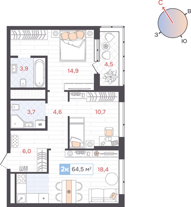 Общая площадь:64.5 м2