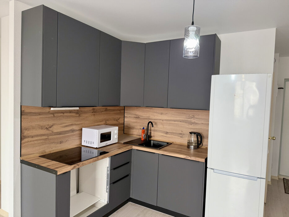 В квартире выполнен ремонт - обои, натяжной потолок, ламинат. Остается кухонный гарнитур с раковиной и смесителем, варочная поверхность, холодильник, обеденный стол, стулья. Также готовы оставить - кровать, тумбы, диван, 2 кресла, журнальный стол.