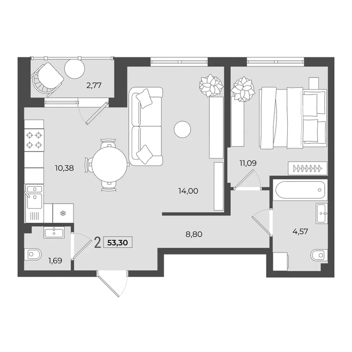 Общая площадь:53.3 м2