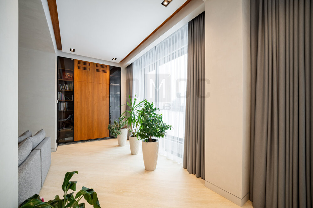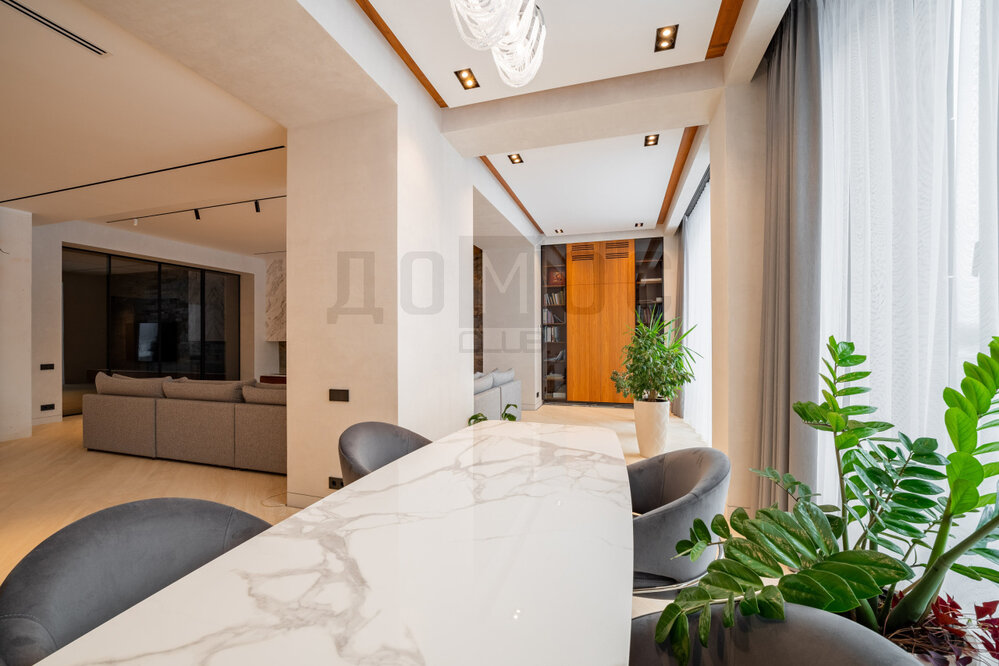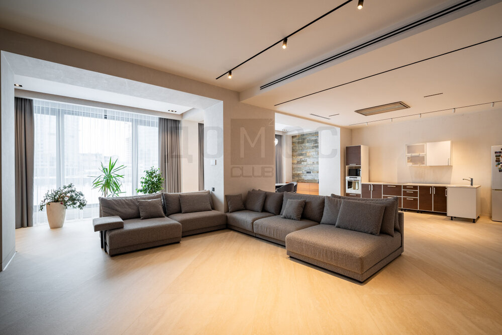 В квартире просторный холл, большая кухня гостиная (96 м2), спальня с гардеробной (21 м2), детская комната (13 м2), ванная, санузел с постирочной и гардеробная комната.