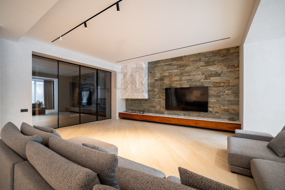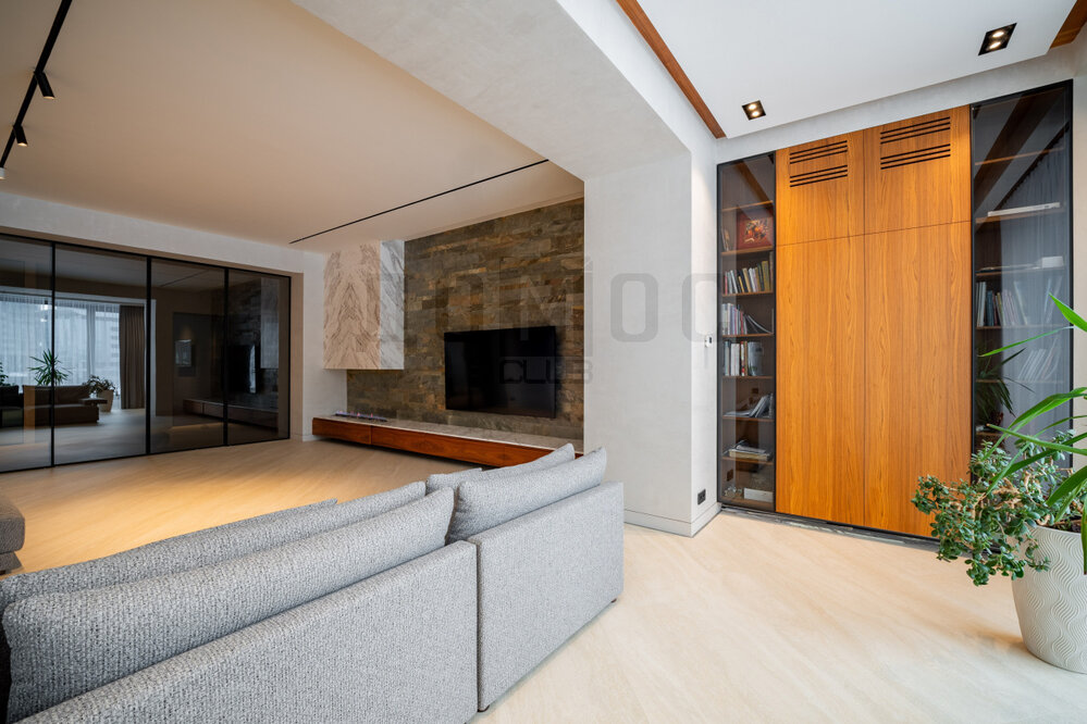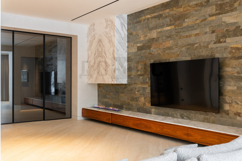 В отделке использованы исключительно премиальные материалы. Все керамические поверхности (пол, стеновые панели, столешницы, фасады, подоконники) фирмы Laminam. Стены также оформлены шпоном цвета орех. Краски Flugger. Выключатели Bticino и прочее.