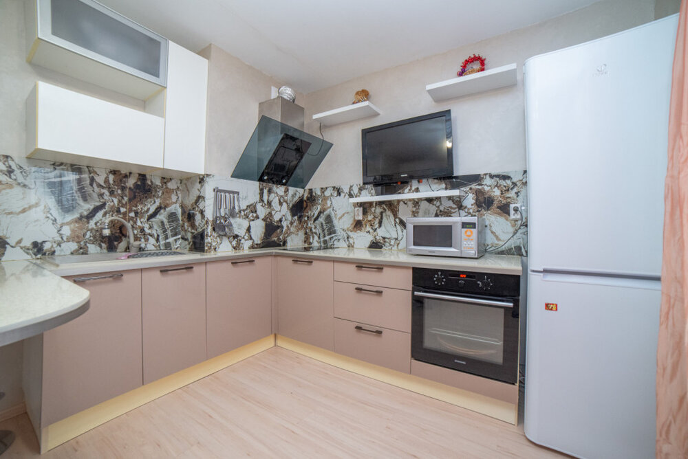 - В квартире остаётся: Шкафы, диван, кровать,холодильник, стол со стульями кухонный гарнитур со встроенной техникой, телевизор на кухне, прихожая.