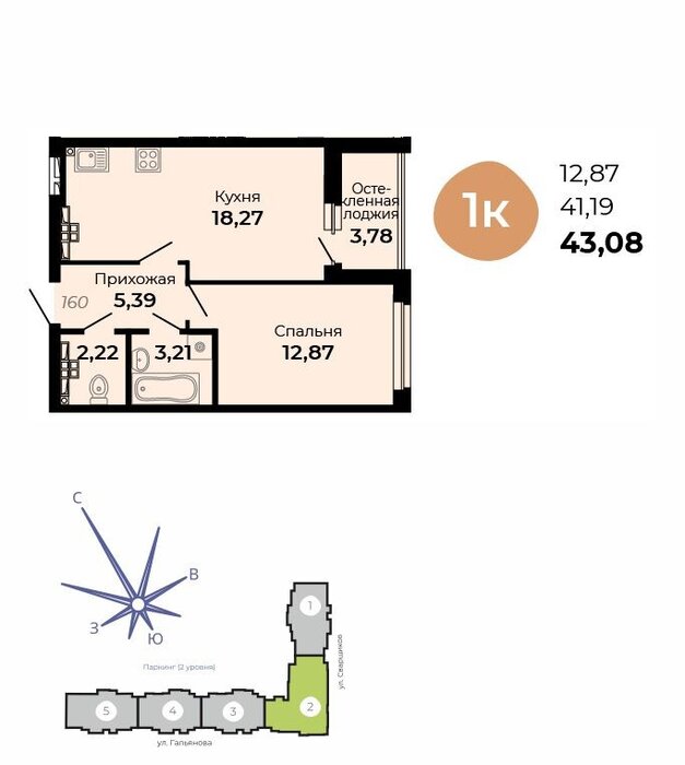 Общая площадь:43.08 м2