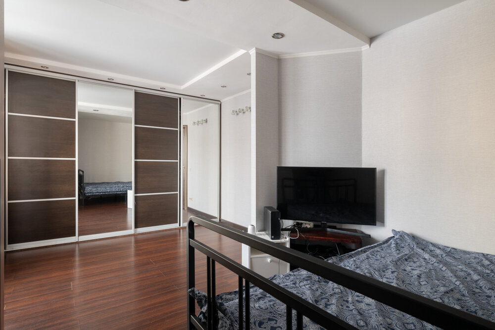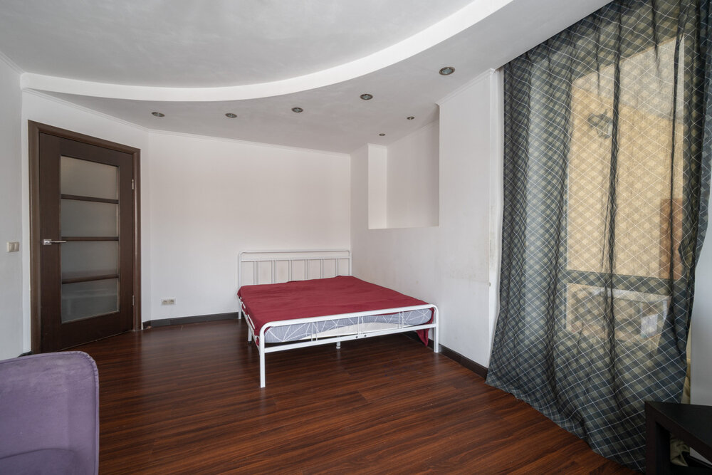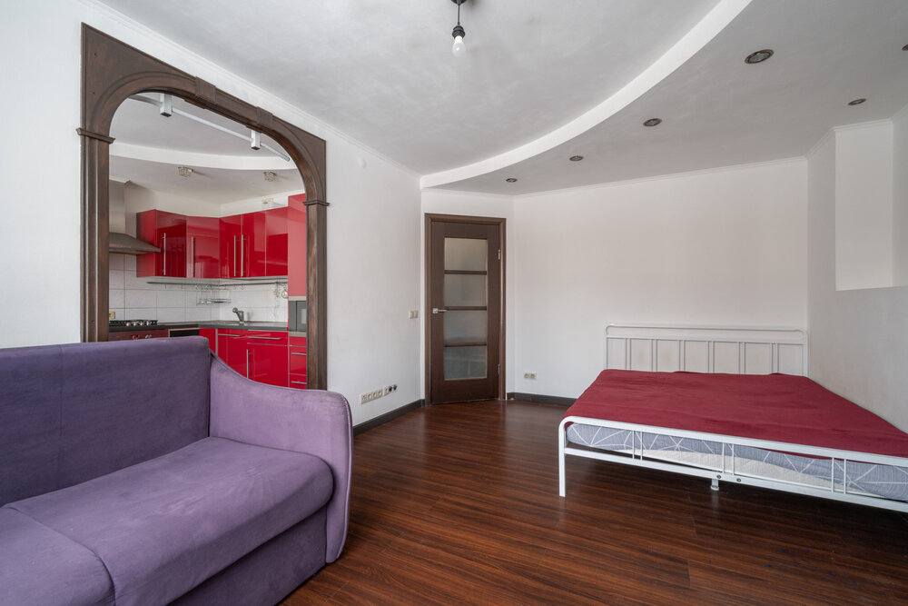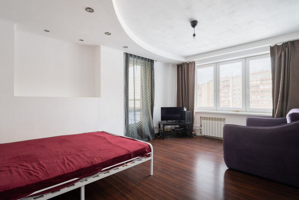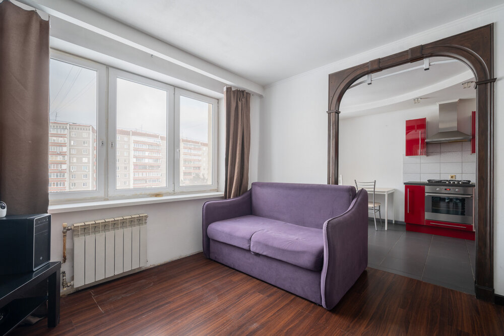 На территории дома большая детская площадка. Низкие коммунальные платежи - летом 5000-6000 рублей, зимой порядка 7000 руб. Все необходимое в квартире есть: это удобная и большая кухня совмещена с гостинной и спальня с выходом на балкон. В квартире останется: кухонный гарнитур, встроенные шкафы.