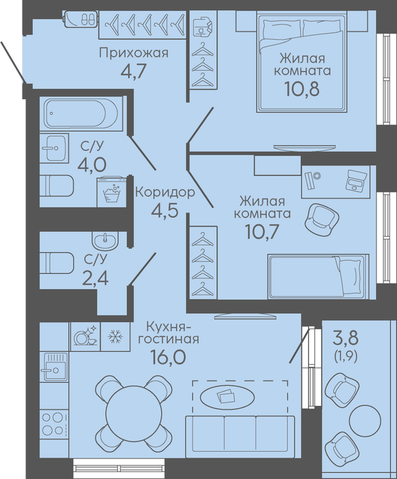 Общая площадь:55 м2