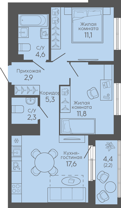 Общая площадь:57.8 м2