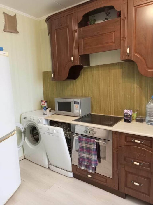 В квартире остается: кухонный гарнитур, газовая плита с электродуховкой, письменный стол, большая двуспальная кровать и диван, два шкафа-купе.
