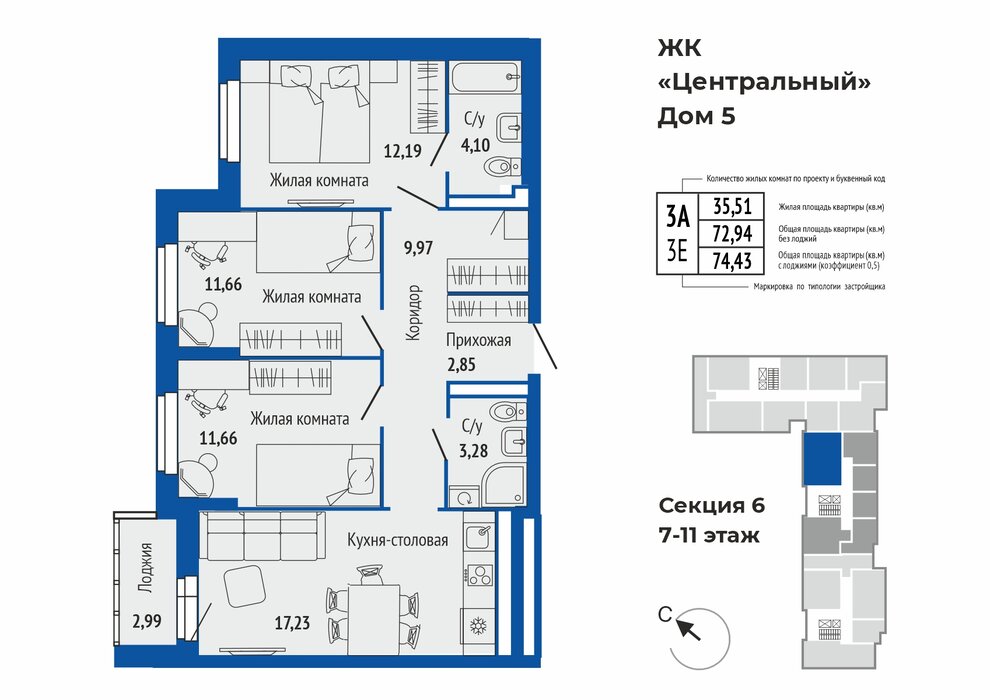 Общая площадь:74.5 м2