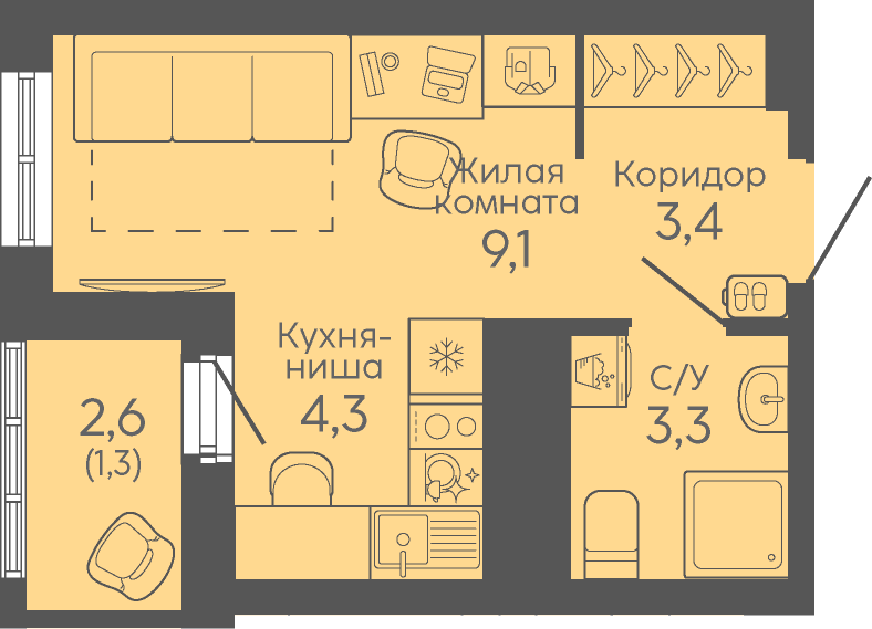 Общая площадь:21.4 м2