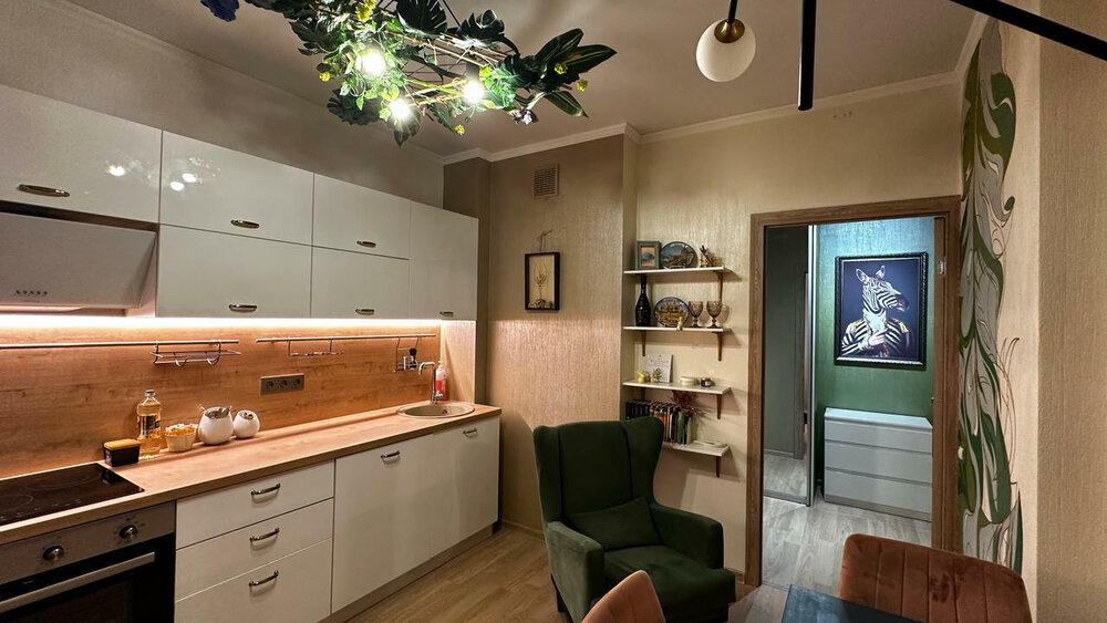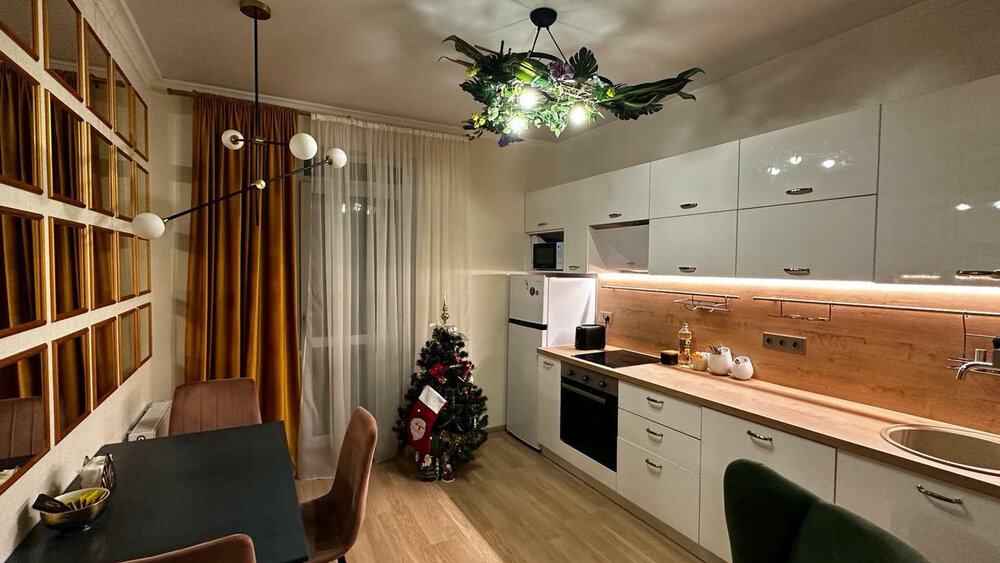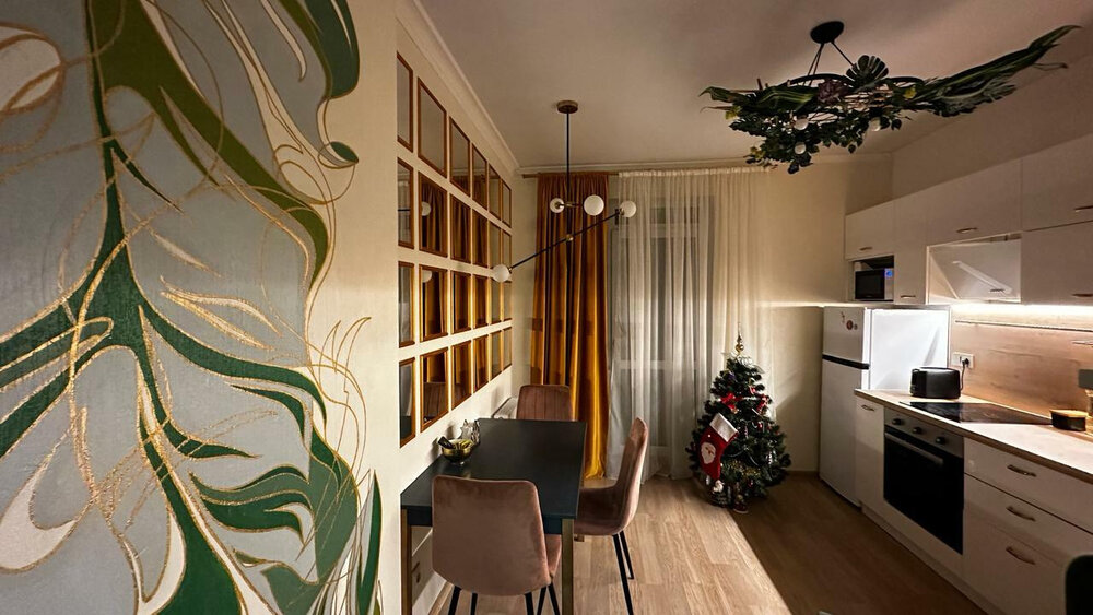 Квартира оборудована мебелью и техникой, все в едином современном стиле. В стоимость входит кухонная мебель с техникой, шкафы.