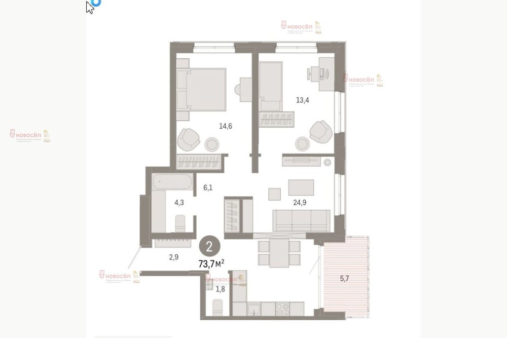 В квартире выполнена предчистовая отделка. Стены выровнены и оштукатурены, на полу ー цементно-песчаная стяжка толщиной 60 мм и слой шумоизоляции. В ванной сделана дополнительная гидроизоляция. Проведена разводка электрики и сантехники, установлены розетки, выключатели, радиаторы отопления с терморегуляторами и приборы учета, показания которых благодаря системе телеметрии автоматически передаются в управляющую компанию. Окна пластиковые, на входе — сейф-дверь.