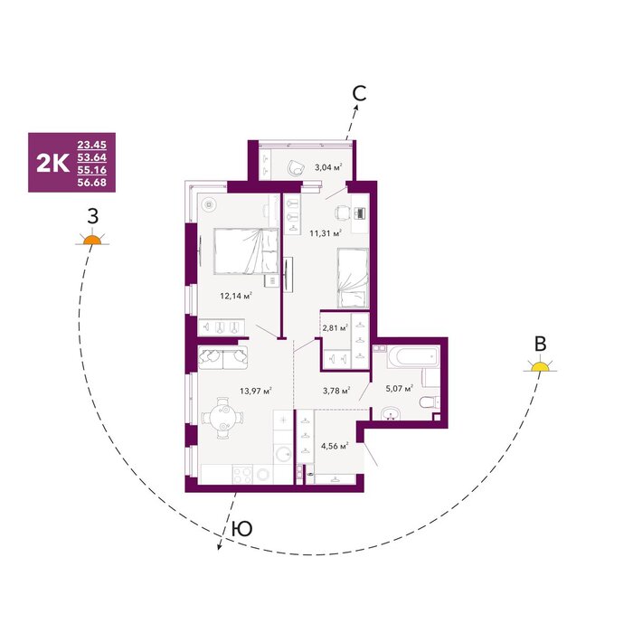 | Общая площадь: | 55.16 м2 |