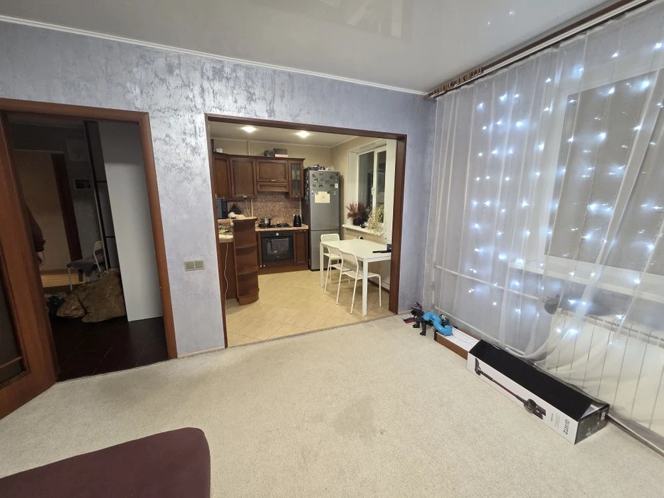 По оснащению квартиры можно отметить , что окна заменены на ( экологически-чистые) , деревянные стеклопакеты, балкон остеклен, частично установлены натяжные потолки, на полу линолеум.
