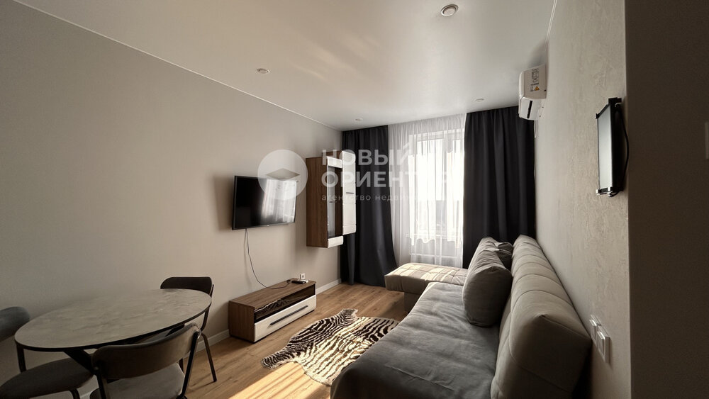Кухня-гостиная: кухонный гарнитур с варочной панелью, духовым шкафом, посудомоечной машиной, обеденная зона, большой раскладной диван (три спальных места), телевизор, кондиционер