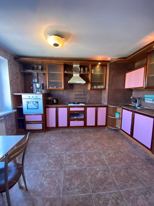 На кухне кухонный гарнитур из массива дерева, барная стойка со шкафом, встроенная бытовая техника Аристон( стиральная машина, духовой шкаф, вытяжка, варочная поверхность, микроволновая печь). На полу качественная итальянская плитка с теплыми полами.