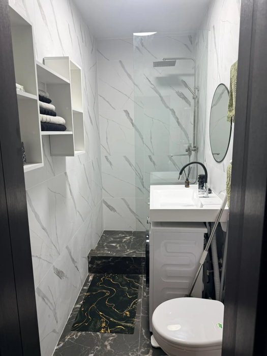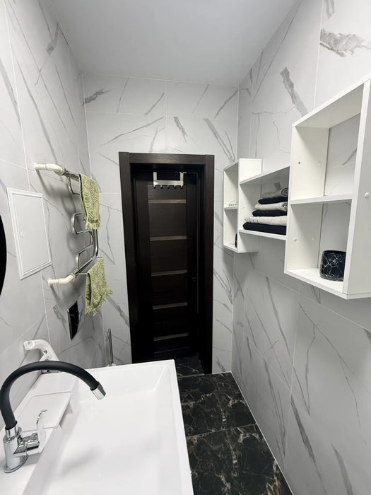 Санузел совмещен, обшит панелями и плиткой, установлены счетчики на холодную и горячую воду. Новая сейф-дверь.