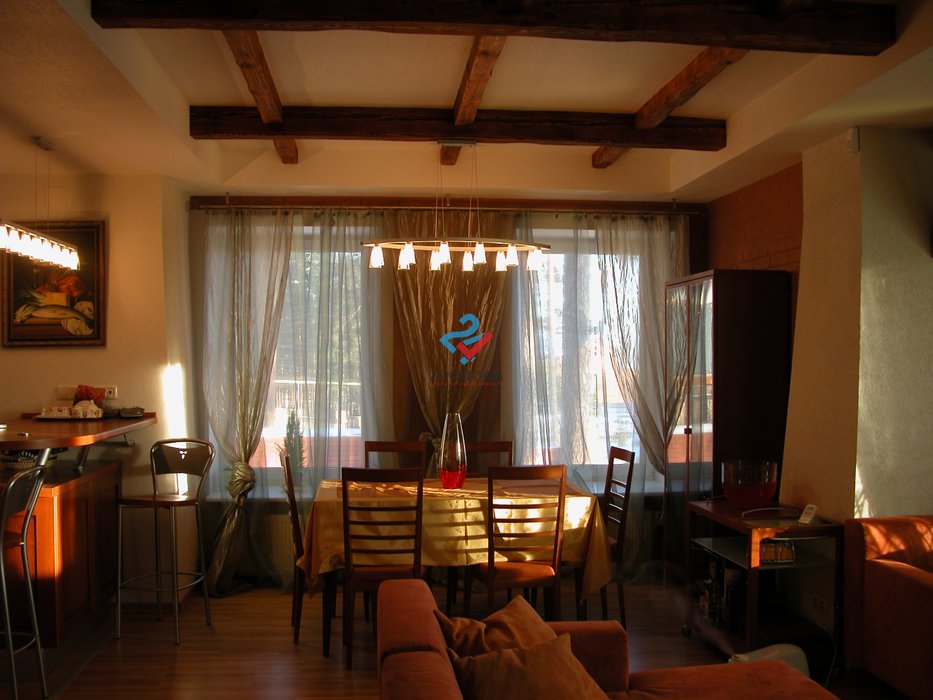 Дом, общей площадью 183,7 м2, имеется цокольный этаж с бильярдной и сауной. В доме сделан шикарный дизайнерский ремонт, мебель и элементы интерьера из натурального дерева.
