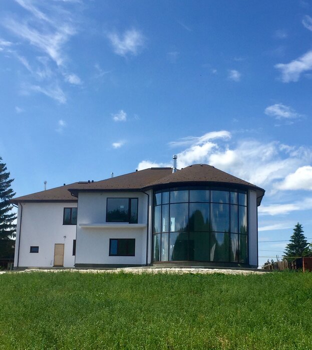 Объект № 188590. Площадь дома 115м2. Земельный участок 10 соток ИЖС. Просторная кухня гостиная 36м2 с высоким сводчатым потолком (высота потолков по проекту от 2.5м до 3.5м), панорамными окнами и выходом на просторную крытую террасу 18м2. С террасы открываются отличные виды, на лес и реку, так как дом расположен на горе. Спальня взрослая 15м2. Просторная детская 15м2. Ванная комната 5.5м2. Просторная прихожая и коридор 10м2. Котельная с дополнительным с/у 5.3м2. Материал стен - профилированный брус камерной сушки 195*145 (все стены в том числе и межкомнатные перегородки). Утепление кровли и пола 200мм. - базальтовая вата в 4 слоя, плотностью 45кг/м3. Материал кровли - металлочерепица 0.45мм., цвет Графит. Фундамент винтовые сваи, монтаж согласно разработанному проекту. Окна панорамные в пол - 5 камерный профиль с ламинацией, мультифункциональные 2-камерные стеклопакеты. Входная сейф дверь с терморазрывом, матовая, цвет графит. Водоснабжение - скважина глубина 50 метров (скважина на улице, благоустроена, вода заведена в дом). Водоотведение - автономная станция биологической очистки. Электроснабжение 380В, монтаж электропроводки скрытого типа (в стенах). Газ по границе участка (под землей, вывод сделан). Монтаж систем отопления включен в стоимость дома. ***Гарантийный сертификат «Защита собственности» по данному объекту в подарок***