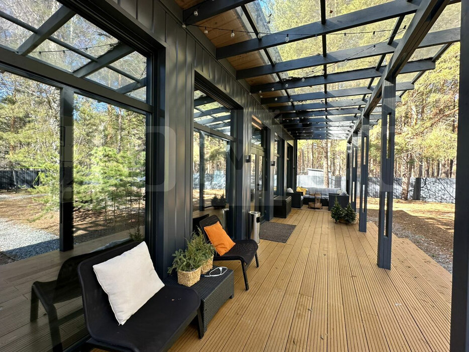 Террасы - ДПК Terrapol. Окна энергоэффективные 2ух камерные стеклопакеты, толщина внешнего стекла 8мм. - закаленное, аргон. Полы - керамогранит.