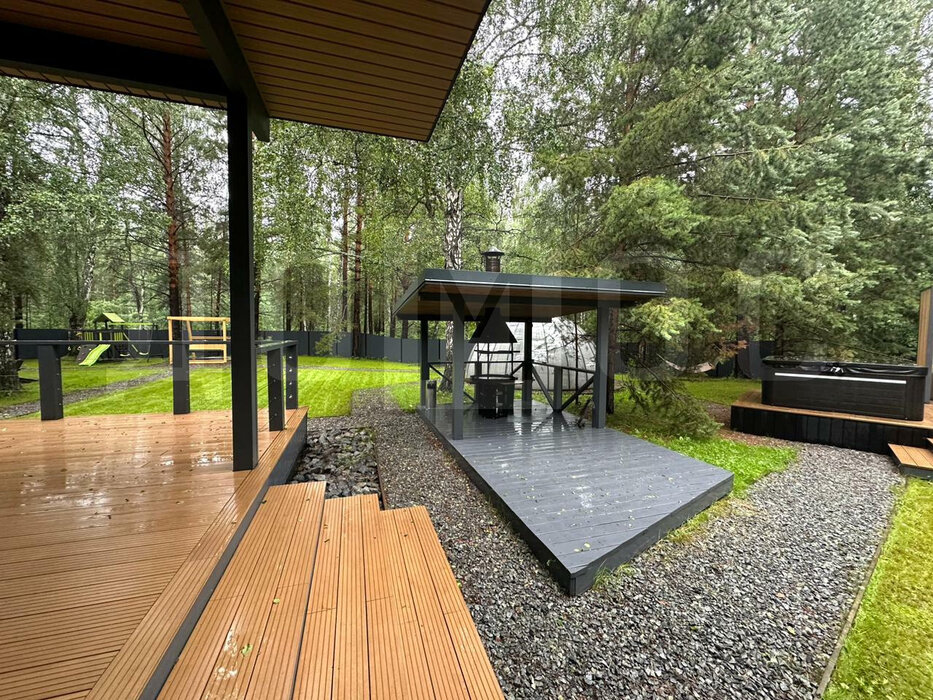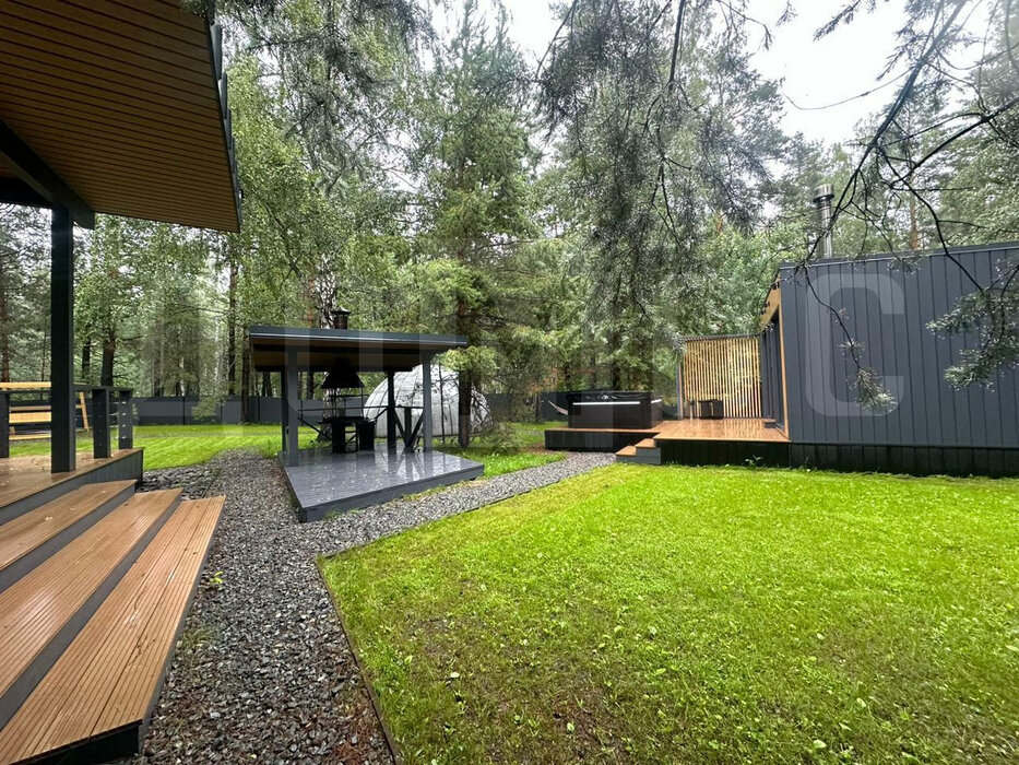 На территории земельного участка : - Новый теплый коттедж с панорамными окнами и большой крытой террасой с видом на лес,- Беседка с зоной для барбекю,- место с костровищем для посиделок,- Детская игровая площадка,- Собственный SPA- мини комплекс с уличным джакузи и баней на дровах.- Домик сторожа- Земельный участок. Комплекс продается со всей мебелью, техникой, предметами интерьера и бытовыми принадлежностями премиального класса. Современный теплый коттедж 120 кв. м. с двумя отдельными спальнями, оборудованной детской комнатой, просторной кухней-гостиной, панорамными окнами и большой крытой террасой.