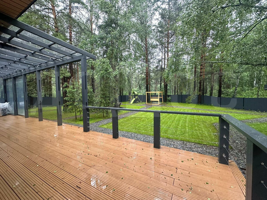 Площадь террасы 53м2. Панорамные окна в кухне- гостиной позволит насладиться завтраком с видом на красивый двор и лес, с полным ощущением уединения в лесу. Атмосферная гостиная с камином и мягкой зоной отдыха будет любимым местом для всей семьи.